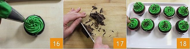 Remove the cupcakes from the oven and let them cool. Put the cream in a piping bag with a star tip and decorate the cupcakes with a swirl of cream 16. Chop the chocolate into flakes 17 to garnish the cupcakes and finish the preparation by decorating each cupcake with mint leaves and chocolate flakes 18. Store the mint and chocolate cupcakes in the fridge until ready to serve.
