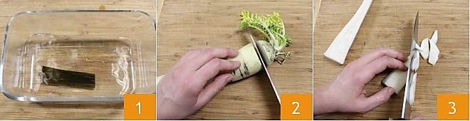 To prepare the miso soup, first soak the sheet of wakame seaweed in cold water 1. Meanwhile, clean the daikon: trim the top and bottom 2, peel it with a vegetable peeler, and finely chop it into small pieces 3.