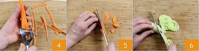 Peel the carrots 4 and chop them into small pieces as well 5; remove the outer leaves from the leek, discard the green part, and finely chop it 6.