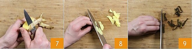 Peel the ginger 7 and cut it into small pieces 8. Squeeze the seaweed, now softened, and finely slice it into chiffonade 9 (How to Cut Vegetables to learn more about this cut)