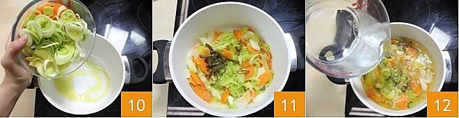 In a large saucepan, sauté the vegetables with a drizzle of olive oil (or sesame oil) for about 10 minutes 10. Add the wakame seaweed 11, then cover the vegetables with water 12.