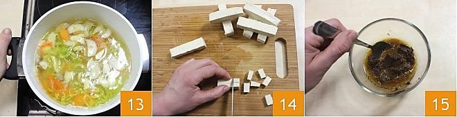 Let everything cook for about 15 minutes 13. Meanwhile, cut the tofu into pieces about 1/2 inch in size 14. Spoon out some broth from the soup and use it to dissolve the miso in a small bowl 15.