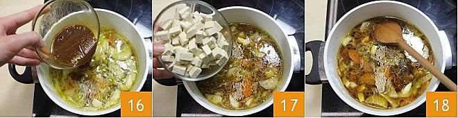 Add the dissolved miso to the soup 16, the tofu 17, then turn off the heat, stir 18, and the soup is ready! Let it cool for five minutes and serve it piping hot!