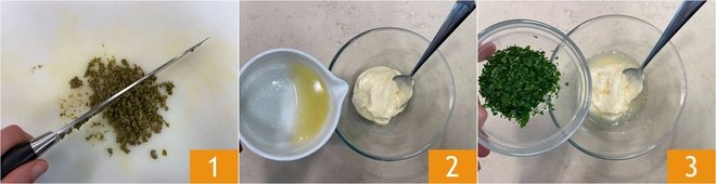 To prepare the mixed fried fish and vegetables, first make the sauce: chop the capers 1, then in a bowl add the mayonnaise, lemon juice, and chopped parsley 3.
