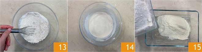 Mix well with a whisk 13 to get a smooth batter without lumps 14. Keep the batter in the fridge and prepare the breading for the fish: in a dish, combine the flour and semolina 15 in equal amounts (about 150 g or enough to bread).