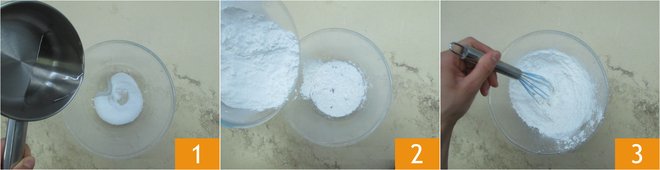 To prepare the mochi, first heat water in a saucepan and pour it boiling over the sugar 1. Add the rice flour 2 and mix with a whisk 3.
