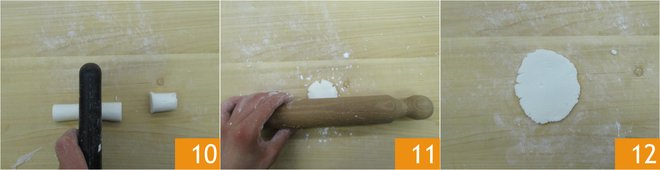 Make small chunks 10. Roll out the dough with a rolling pin 11 to create small discs 12.