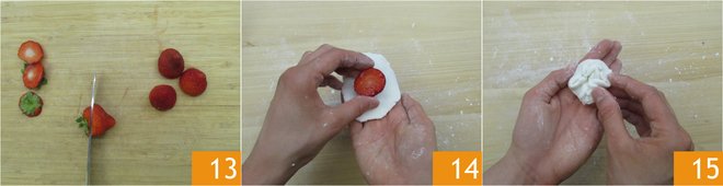 Wash and dry the strawberries, then remove the stem 13. Wrap the strawberry with the dough disc 14 and seal the end 15.