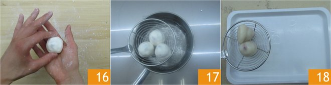 You should obtain a cone shape resembling the strawberry 16. Boil the Mochi 17 for a few minutes until they float to the surface 18.
