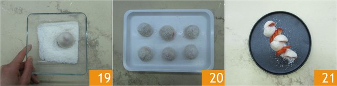 Then roll them in shredded coconut 1920. The mochi are ready to be enjoyed 21.
