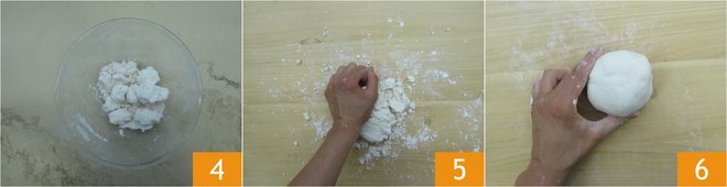 Once the ingredients are gathered 4, transfer the dough onto a work surface and knead 5 until it forms a homogeneous dough ball 6.
