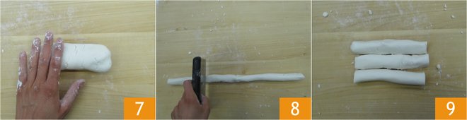 Take the dough ball and roll it out 7 to form logs, cut them into smaller pieces 8 9.