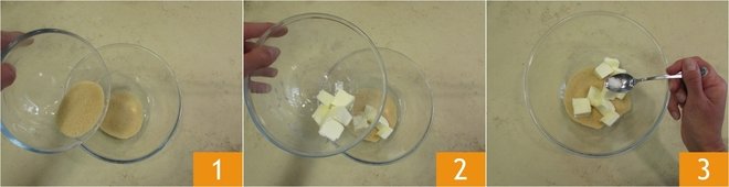 To make the cake, start with the base: in a bowl, pour the sugar 1, the butter cut into pieces 2, and the salt 3.
