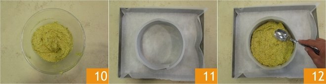 Mix until you get a homogeneous mixture 10. Butter and line with baking paper the inside of an 18 cm (7 inches) ring 11 and place it on a baking tray 11. Pour the mixture here and level it with the back of a spoon 12. Bake in a static oven at 356°F for 15 minutes.