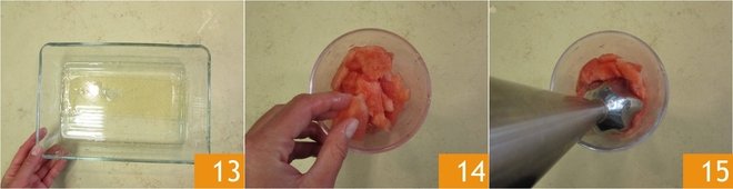 Soak the 10 g of gelatin sheets in cold water 13. Cut 300 g of watermelon pulp into pieces, put them in a tall glass 14, and blend with an immersion blender 15.