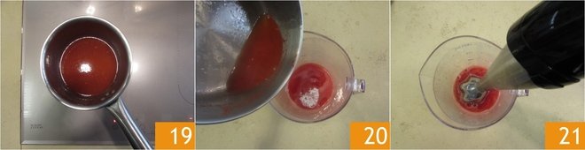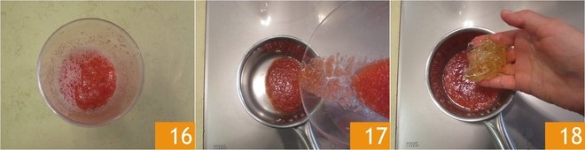 Once blended 16, pour a little of the obtained juice into a saucepan 17, add the soaked and squeezed gelatin 18 and heat until fully dissolved.