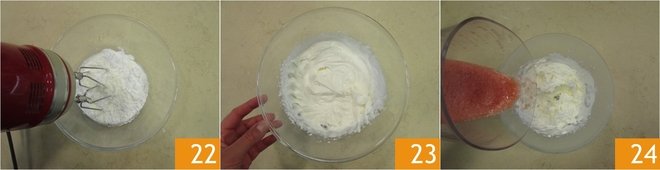 In a bowl, pour the cream and powdered sugar, work with the beaters 22 until you get a semi-whipped mixture 23. Pour the watermelon juice into the cream 24.