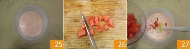 Gently blend with a whisk 25. Transfer to the refrigerator until use. Cut 150 g of watermelon into cubes of about 1.5/2 cm (0.6/0.8 inches) 26 and pour them into the cream 27.