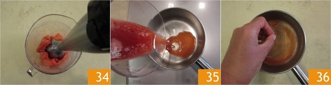 After the firming time, work on the coating: soak the 5 g of gelatin and blend 200 g of watermelon 34. As done previously, pour a little of the mixture into a saucepan 35 and heat it. Add the soaked and squeezed gelatin 36 and mix until fully dissolved.