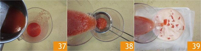 Pour the juice with gelatin into the remaining mixture 37, mix with a spoon. Strain the mixture with a fine mesh sieve 38 and pour over the surface of the cake 39.