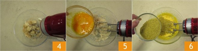 Work the ingredients with an electric mixer for a couple of minutes 4. Add the eggs 5 and continue mixing until all the ingredients are combined. Now incorporate the pistachio flour 6.
