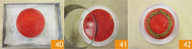 Transfer to the freezer for about 1 hour or in the refrigerator for 4 hours 40. Once firm, unmold the watermelon mousse cake 41. Decorate with pistachio crumbs before serving 42.