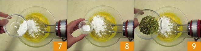 Add the cornstarch 7, the baking powder 8, and the pistachio crumbs 9.