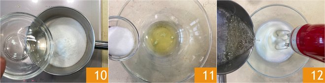 Meanwhile, prepare the Italian meringue starting with the syrup: in a saucepan, pour 5.3 oz of sugar and the water 10. Heat and let the sugar dissolve, being sure to monitor the temperature with a thermometer; it should reach 250°F. Meanwhile, in a bowl, add the egg whites and the remaining 1.4 oz of sugar 11, then start whisking. When the syrup reaches temperature, pour it into the egg whites in a thin stream 12, continuing to whisk at low speed until the mixture has cooled.
