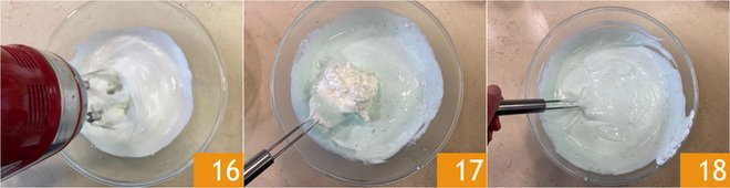 The Italian meringue will be ready when it looks glossy and lifting the beaters will form a peak with a tip 13, the so-called “beak”. Add the meringue to the mint mixture 14 and mix with a whisk to incorporate it 15. Let it rest in the fridge for about 10-15 minutes, so it sets but doesn’t gel.