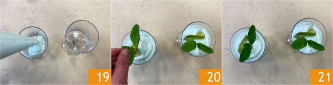 Distribute the mousse into 6 glasses with a capacity of about 3.5 oz 19, then decorate with lime slices and mint leaves 20. Keep refrigerated until serving. Your mojito mousse is ready to enjoy 21!