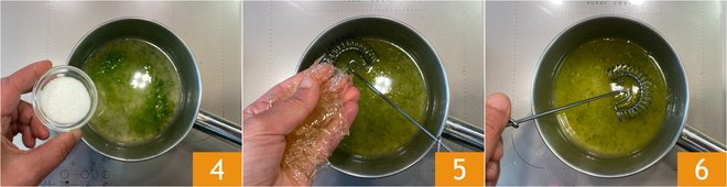 Add the sugar 4 and heat for a few minutes, stirring. At this point, add the well-squeezed gelatin 5 and let it dissolve completely 6.