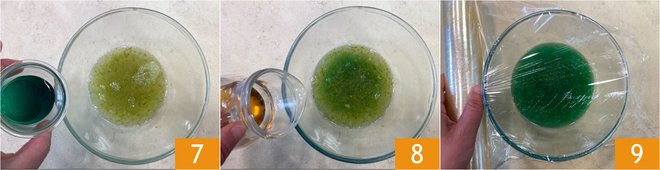 Transfer everything to a bowl, then add the mint syrup 7 and the rum 8 and mix. Cover with plastic wrap 9 and let cool to room temperature.