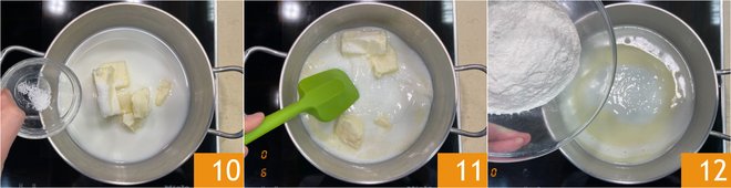 In the meantime, start with the choux pastry: pour the water and milk into a saucepan 7, then add the butter 8 and sugar 9.
