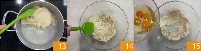 When the mixture detaches from the sides, forming a white film at the bottom, continue stirring for a couple more minutes 13, then transfer it to a cold bowl and spread it out to cool faster 14. Now add one egg at a time 15, mixing thoroughly to incorporate it before adding another.