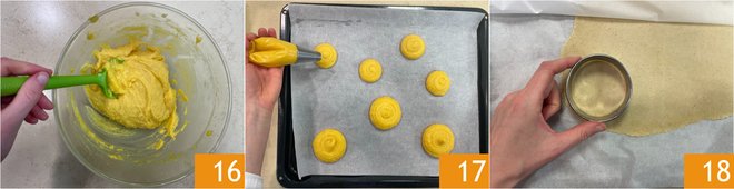 When you have obtained a smooth and elastic dough 16, transfer it to a piping bag with a 3/4-inch plain nozzle. Line a baking sheet with parchment paper and draw 10 circles with a diameter of 2 inches and another 10 with a diameter of 1 inch; then, follow the outlines to pipe blobs of dough of these sizes 17; this will make it easier to achieve round and precise puffs. Take the craquelin dough from the freezer and cut out as many circles of the same size, using a 2-inch cutter and a 1-inch cutter 18.