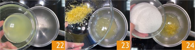 Now focus on the lemon curd filling: in a double boiler, pour the lemon juice 22 and grated lemon zest 23, then add the sugar 24.