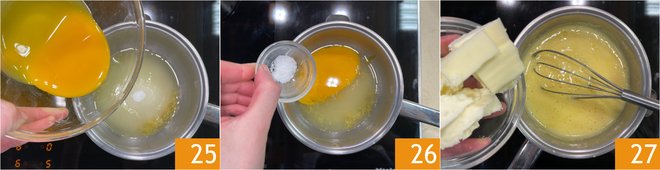 Add the yolks 25 and salt 26. Turn on the medium heat and let it thicken, stirring continuously with a whisk. When the mixture reaches the consistency of custard, turn off the heat and add the butter 27.