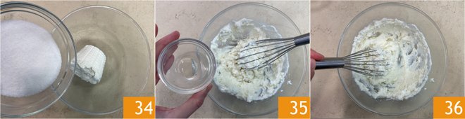 Meanwhile, combine the ricotta and sugar in a bowl 34, add the orange blossom water 35 and mix well with a whisk 36.