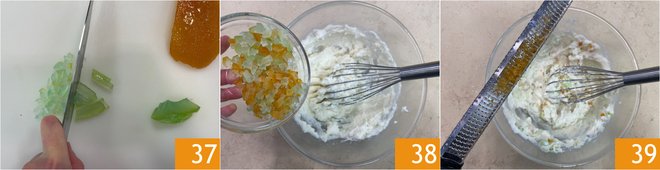 Cut the candied fruit into small cubes 37 and incorporate them into the mixture 38, then flavor with grated orange zest 39.