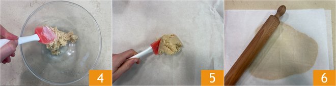 Mix with a spatula until you get a homogeneous dough 4. Transfer the dough onto a sheet of parchment paper 5, cover with another sheet, and roll out with a rolling pin to form a sheet about 1/8 inch thick 6. Transfer the sheet onto a baking tray with its parchment paper and let it firm up in the freezer for about 15 minutes.