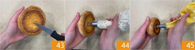 You are ready to assemble the dessert: take the larger puffs and make a hole at the base with the tip of a knife 43, then insert the piping bag nozzle and fill them with the pastiera filling 44. Do the same with the smaller puffs and fill them with the lemon curd filling 45.