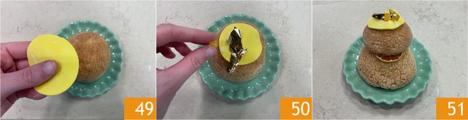 Finally, garnish with a thin circle of yellow sugar paste 49, a gold leaf, and a piece of candied orange 50. Your mon sciù di pastiera is ready to be served 51!