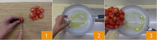 To prepare monkfish with fresh tomato sauce, start by washing and drying the cherry tomatoes, then cut them in half 1. Drizzle a non-stick pan with a little oil and sauté a clove of garlic, peeled and halved 2. Then add the cherry tomatoes 3,