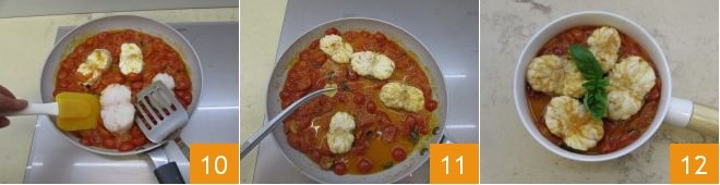 Then, using a spatula, turn the fish fillets to ensure even cooking 10 and let them cook for another 1-2 minutes. Remove the garlic 11 and turn off the heat. Your monkfish with fresh tomato sauce is ready to be enjoyed, perhaps adding a fresh basil leaf 12!