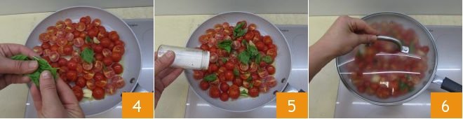 tear the fresh basil directly over the cherry tomatoes to flavor 4 and season with salt 5. Let it cook over low heat for 10 minutes, covering with a lid 6.