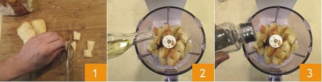 To make the monkfish with potatoes, first prepare the breadcrumb mix: cut the fresh bread into cubes 1 and place it in a food processor. Add the extra virgin olive oil 2, salt, and pepper 3,