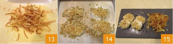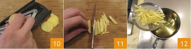 Meanwhile, you can prepare the potatoes: wash the potatoes to remove any soil residue and dry them well. Without peeling, slice them to a couple of millimeters thick using a mandoline 10; stack the potato slices and cut them into fairly thin sticks 11. Heat the peanut oil in a saucepan to a temperature of 265°F-285°F (measure with a kitchen thermometer), then immerse a few potatoes at a time 12 and fry them for about 5 minutes.