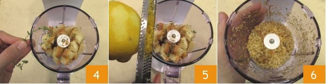 the thyme leaves 4, and the grated lemon zest 5, and pulse the processor until you obtain a coarse texture 6.