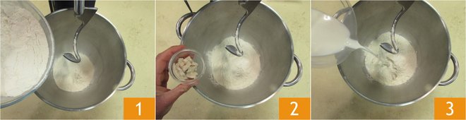 To prepare the montanarine with burrata and smoked salmon, add the all-purpose flour 1, crumbled yeast 2, and milk 3 into the stand mixer bowl. Knead with the hook for 5 minutes until the dough is hooked to the hook.
