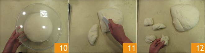 After the resting time 10, transfer the risen dough to the work surface and divide it into 20 pieces of about 1.6 ounces 12 13.